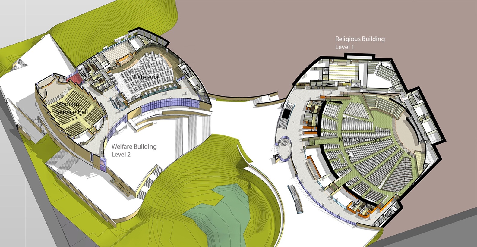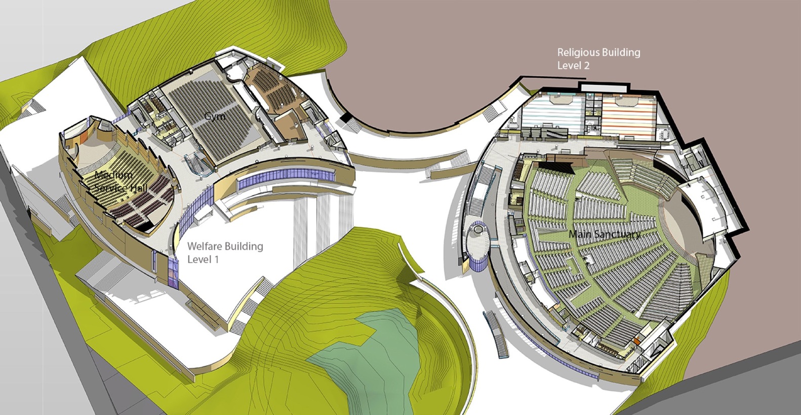 Beck的解決方法是,在一個383,500平方英尺(35628平方米)的設計中將景觀與流暢的線條結合在一起,包圍在一個大型中心廣場外。空間包括了一個2700座的圣堂,800座的小禮拜堂、餐飲、咖啡館、圖書館、健身中心、青少年活動中心、福利部門設施,以及一個能停放350輛車的地下車庫。將建筑置入自然山體中的手法,以及中心化的開窗讓充足的自然光照射進入室內,同時也提供了更高的能源效率。