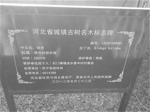 記者看到該銀杏樹與村民家毗鄰而居,樹下四周已被護欄保護起來,并設立了保護標志牌,幾個主干分枝也安裝了支架。從立于2012年的《河北省城鎮古樹名木標志牌》上記者了解到,這株銀杏樹為國家特級保護名木,銀杏樹樹齡已有2800多年,樹高18米,樹圍7.44米,冠幅平均22.5米,東西25.5米,南北19.5米,生命力極其頑強,每年還能結白果100千克左右。由于樹齡偏高,中空的樹洞中抽生10條粗細不等的枝根,向樹洞內土壤中扎入,從根部又萌生3條以上新枝。