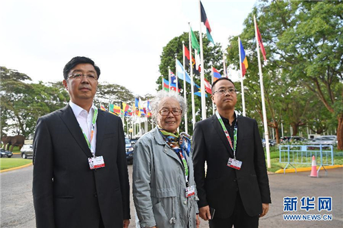 這是12月5日在肯尼亞內羅畢聯合國環境規劃署總部拍攝的塞罕壩林場老中青三代陳彥嫻(中)、劉海瑩(左)、于士濤的合影