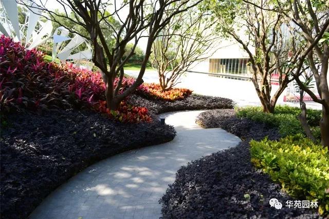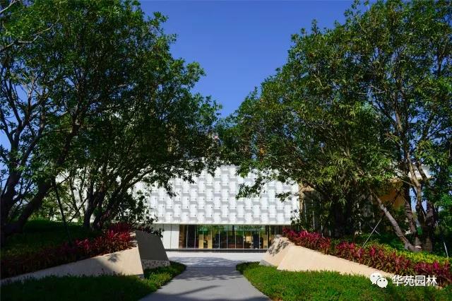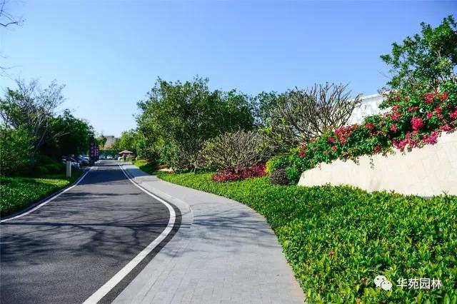利用綠坡營造空間高差,搭配叢生水蒲桃、叢生和順樹等大喬,紅花繼木、泰國龍船花等花灌構成花境,加上雕塑的點綴,創造出絢麗多彩,疏密有致的綠化空間。由芝麻黑花崗巖鋪貼而成的弧形園路,線條流暢,嚴絲合縫。兩側的變葉木、灑金桃葉珊瑚等常綠灌木,與紅花繼木、巴西夜牡丹等花灌相互映襯,對植的叢生柚子增添秩序感,配合地形變化,營造出熱烈的景觀氛圍。