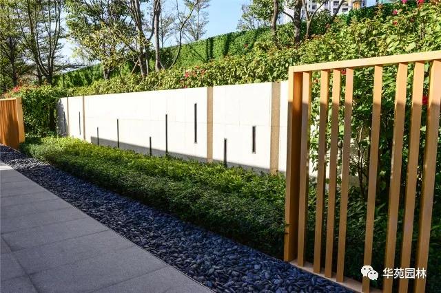 Logo景墻由黃金麻花崗巖鋪貼而成,折面造型和斜鋪的飾面相結合,彰顯高雅氣質。黃金榕球、非洲茉莉球等灌木,與艷麗的勒杜鵑相搭配,豐富了空間層次及色彩。