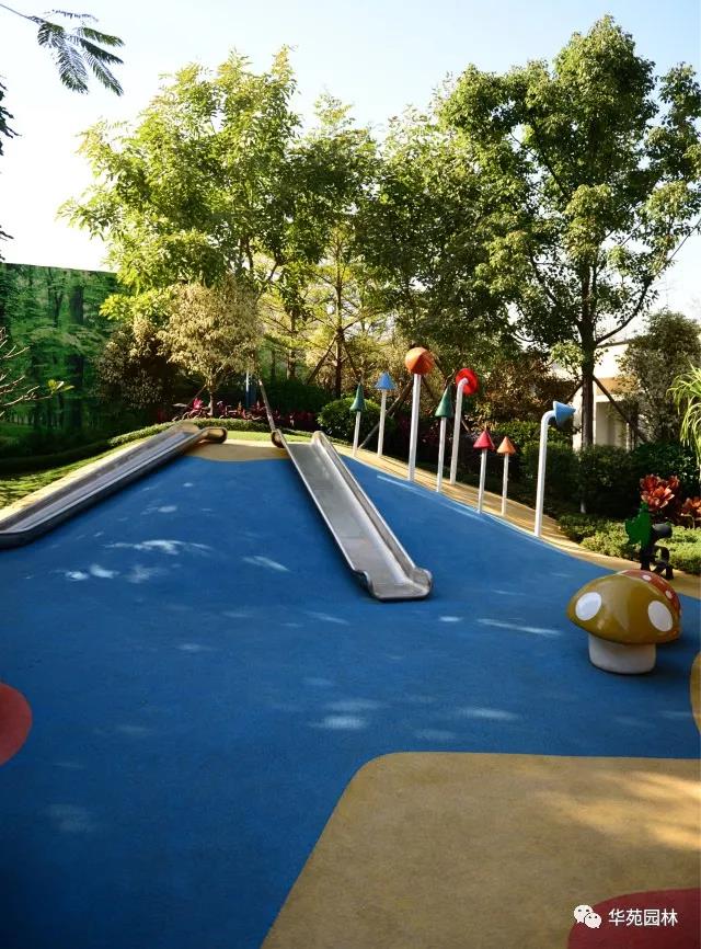 兒童活動場地以橡膠地墊拼鋪出起伏的地形,與圓順平實的綠坡結合,渾然一體。鳳凰木、仁面子、澳洲火焰木等喬木勾勒天際,細葉棕竹、亮葉朱蕉、馬拉尼草等灌木地被相互搭配,營造出豐富多姿的綠化景觀。