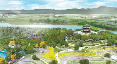 10月11日,記者在現場看到,園區最高的建筑——天田山頂的永寧閣已經揭開了面紗,這是一處典型的中國傳統風格宮苑建筑,采用“高臺閣院”式布局,整體意象可以概括為:花田錯落,重臺參差,回廊環繞,高閣聳峙。