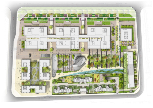 景觀區域由三個不同的分區或者特征區組成,分別對應的三種不同的用途:商業零售、中央公園和居住。