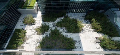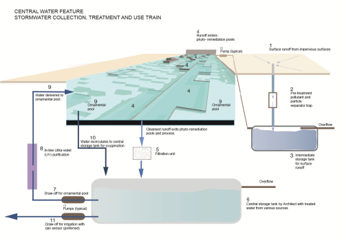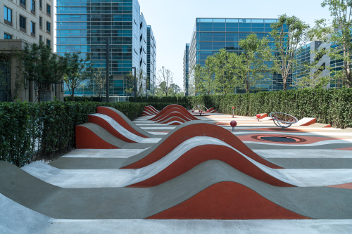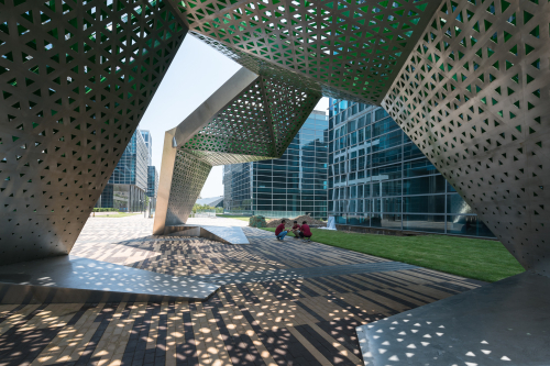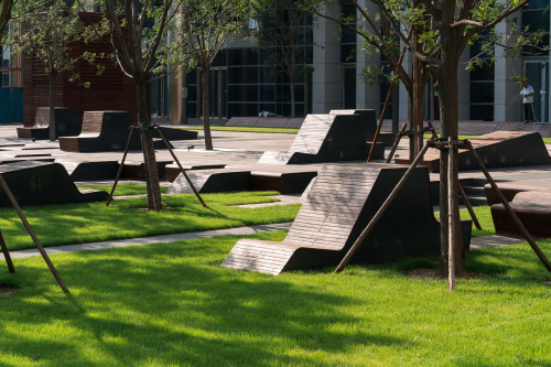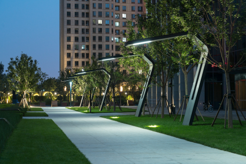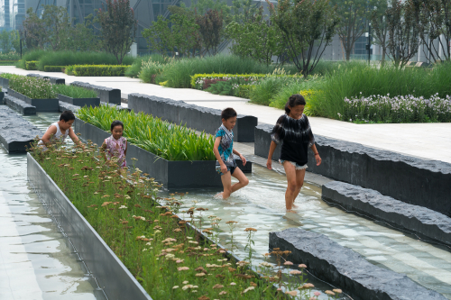 場地的總體設計充分考慮 LEED 金獎認證體系的要求,通過對水的高效利用、降低鋪裝表面面積、增加綠色覆蓋比率等措施來緩解城市熱島效應;充分考慮每個社區的微氣候,對冬季西北風設置屏障,促進夏季東南風的流通;在區域南側設置大型水景,起到降溫效果。