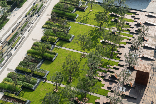 中央公園是一塊開放空間,有“公共綠地”和 “下沉花園”。“陽光之角”花園構成下沉草坪區的邊界,種植池被抬高,里面種植低矮的綠籬植物、裝飾性草坪和多年生草本植物。邊緣可供人們坐臥休息或者沐浴陽光、欣賞美景。休閑椅的位置經過精心的設計,并充分利用花園中的陽光直射點。中央公園的另一個主要特征是水景。美麗的水景可供當地居民娛樂休閑,同時在南側私人住宅區和北側公共開放空間之間起到隔離作用。