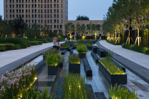 商業零售區包括總部辦公大樓周邊地帶、辦公區庭院花園、渠北路步行道和生態區。生態區位于場地最北邊,是一條具有生態功能的線性景觀,場地中的所有降水都在這里匯集和吸收。