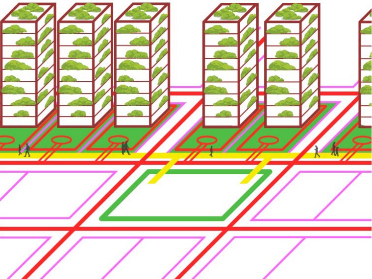 其實什么最重要?紅色(交通)最重要,紅色不搞好,綠色、藍色、黃色就大大減少了。空間規劃包含著交通。需要走動,需要自行車,需要在區域里面坐公交。區域外的就是要快速的交通系統,所以我們會用這樣的方式,把快速的交通布置在下面,比較慢的可以在第一層,非常慢的在第二層。這樣的做法就可以讓我們在首層、二層打造人居環境,這個人居環境必須要延伸到上面,因此我們覺得立體規劃是城市里面必須有要的,如果只靠第一層和第二層,尤其是高樓大廈,如果你每次都要回到第二層和第二層來做社交,那就太遠了,空間也非常有限。