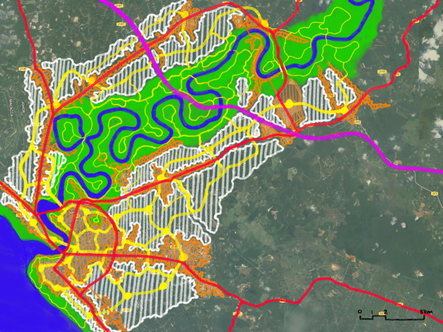 麻坡有了這樣的規劃,面對馬六甲的延伸就有一定的策略。講到這點,還有一個大課題還沒解決。即使規劃能把這些城市和鄉村提供長遠的發展和大方向,但海水位一直在上升,500年、1000年后海水到了三米四米,那怎么辦?這些都是有科學根據,不是設計討論。這是五百年一千年后的馬來西亞和新加坡。我們現在還是講鄉土文化,但這文化的基本條件除了家,還有環境,包括土地。而這個大環境不是單單國家可以保護的,而是必須要我們全世界的合作來照顧地球的。