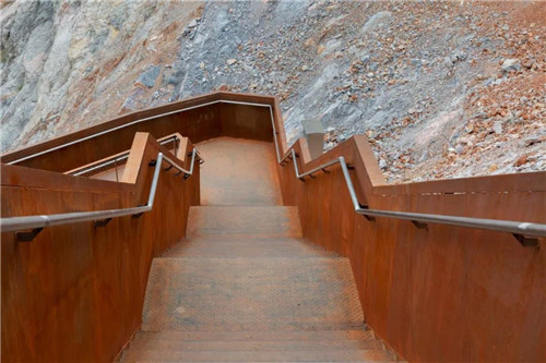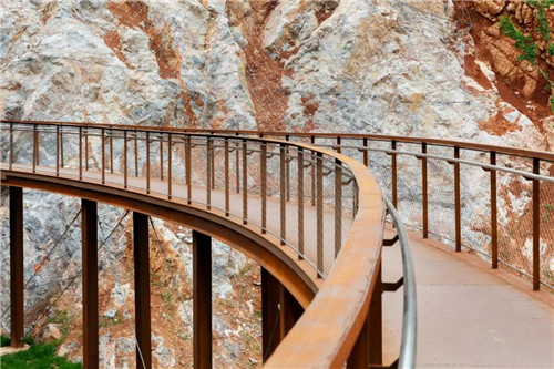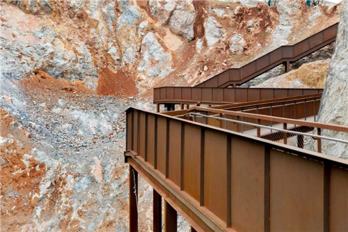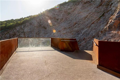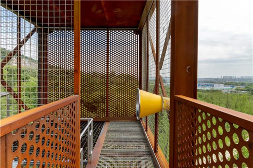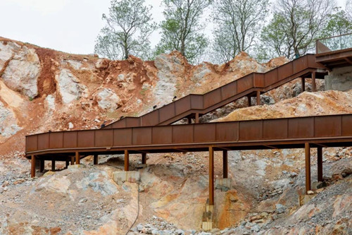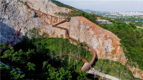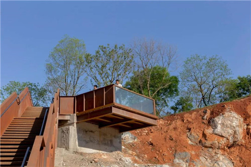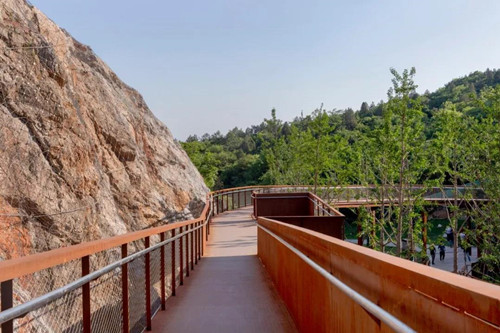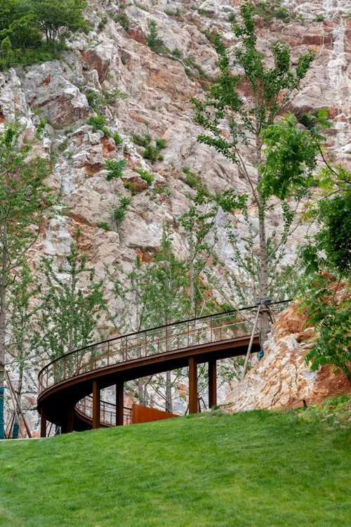 游人進入公園后先到自然匯水而成的濕地湖泊區,然后沿坡道到達濕地草甸及阡陌花澗。通過一個“時光隧道”進入第一個宕口的底部,然后拾階而上逐漸體驗曾經的采石場粗獷陡峭的巖壁,幾經轉折到達一個可以遠眺公園全景的平臺。這里是舊有采石場堆放廢棄石渣形成的一個相對平坦的場地。之后,通過棧道進入相鄰的另一個宕口,沿側壁逐漸下到坑底,從坑里出來到達礦野拾趣樂園。