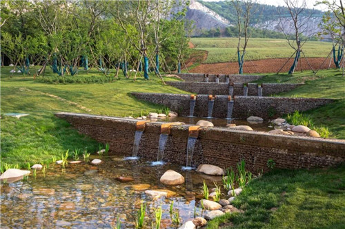景觀設計通過梳理現場地形和水文,在已經被破壞的自然碎片基礎上形成豐富的體驗場所,包括四個不同景觀功能的宕口(溫泉酒店、攢子瀑、天空走廊、伴山營地),阡陌花澗、礦野拾趣與三疊湖,以及服務配套的餐廳茶室等。