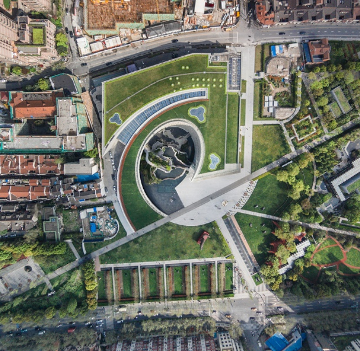 項目位于上海淮海路核心區域,博物館一開始規劃,被譽為是上海最“矮”的地標,變成市區乃至全國的自然活動地區。這里原來是上海的老房子、菜市場,現在是中國最大的市民公共活動和展示空間。王焱公司的芝加哥建筑師做了一個空間,房子不是太高,并且房子的3/5在地下。通過螺旋形的下沉廣場,室內感覺不到下沉空間。結合了原來場地的同時,文化也做了融合,社區活動、社區公共藝術都是和公園結合在一起。整個空間的區域高度基本相同,綠色空間有機結合。在自然環境和人的生活空間中,開放空間體系非常重要。