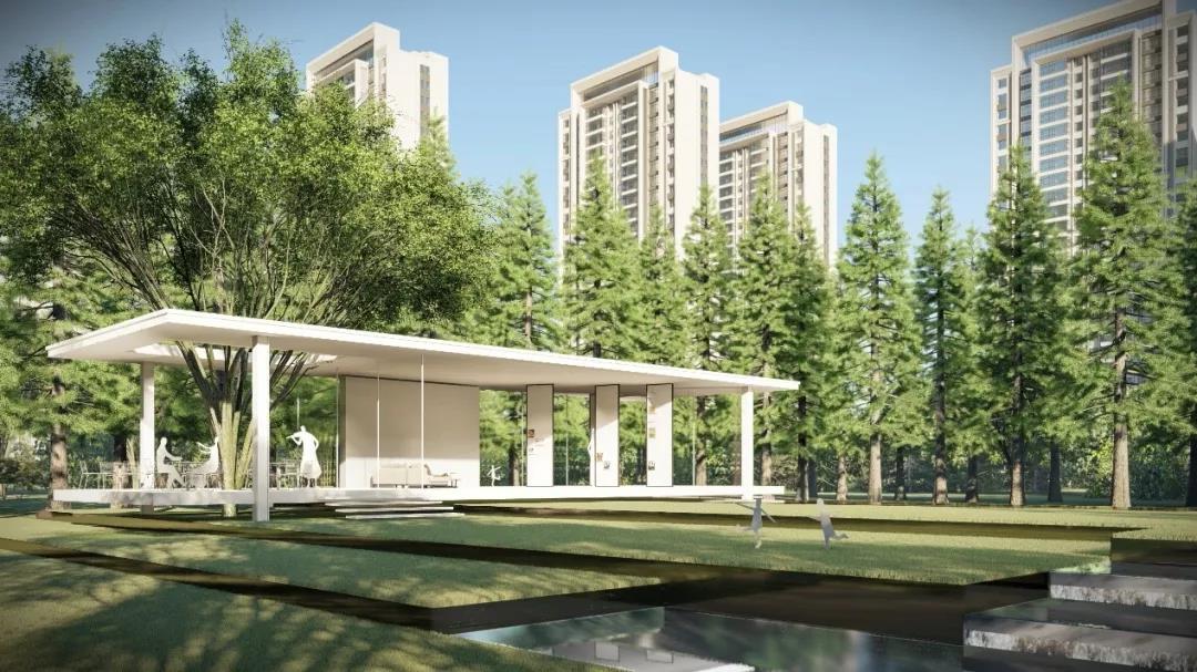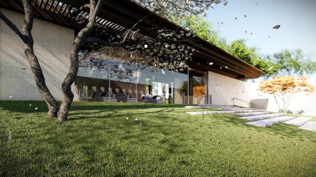 以簡約、大氣的手法結合綠地和水景涌泉,打造自然靜謐的藝術休閑空間。