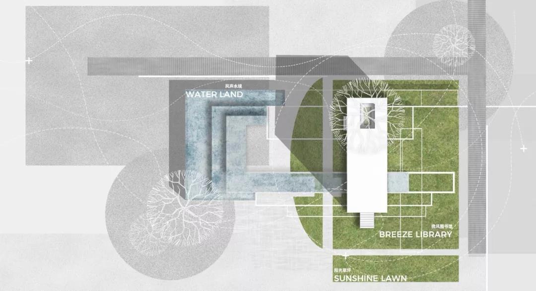 中央綠地與前水景緊密聯系,在靜謐的閱讀空間中伴有潺潺水流之音,給人提供舒適的休憩空間。景觀結合樹木、草地、水景、光影變化的效果,打造大自然森林場所。