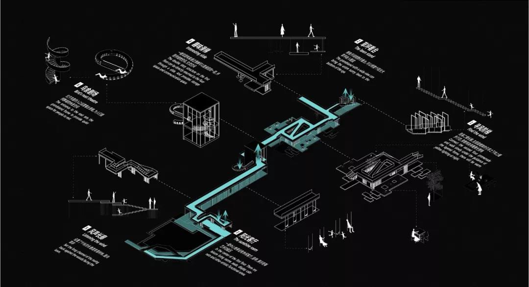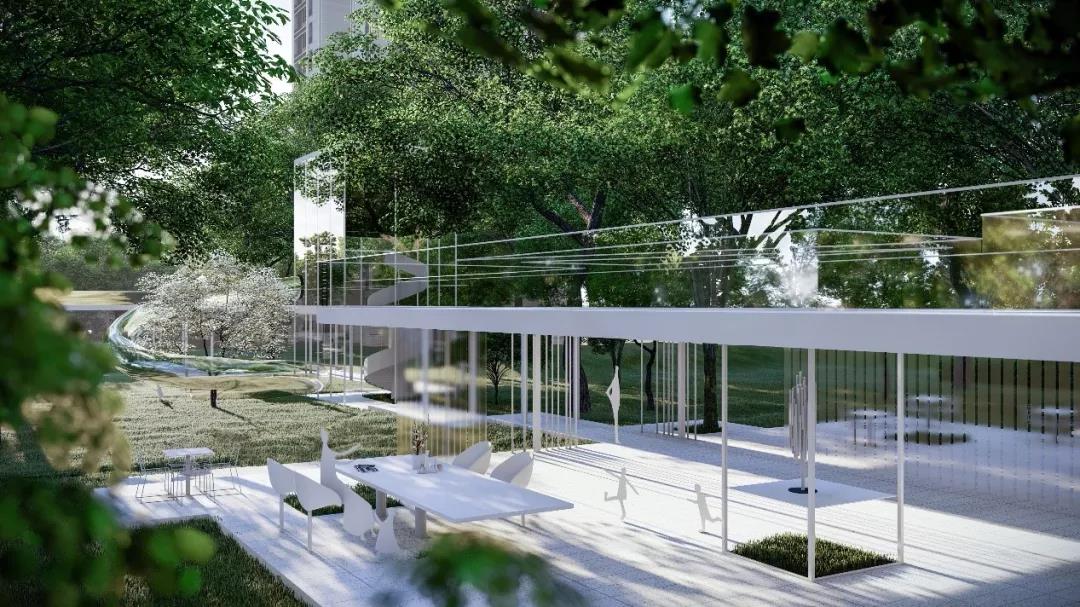 多維度的藝術上升空間,提煉建筑的立面質感打造極具現代感的肌理。場地設置有觀景平臺、旋轉樓梯、娛樂滑梯、微風秋千、露天餐吧以及藝術展覽空間,是真正提供給各個年齡階段的住戶的多功能活動空間,讓身處“風森劇場“中的人們似風般輕盈地穿梭在林間。