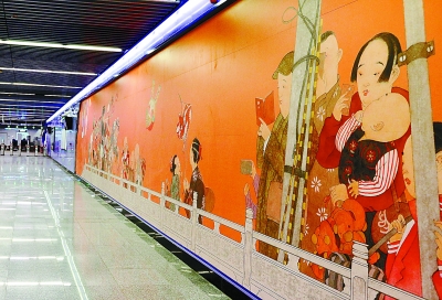 “相比之前以車站所在地歷史為主題的創作,7號線東延還融合了更多現代元素。”7號線東延公共藝術品創作單位、北京科瑞迪國際文化傳播有限公司總經理張俊青介紹,像萬盛東站,主題以通州運河為背景的“舞龍舞獅”“端午賽龍舟”與舶來品“水上樂園”“帆船暢游”。壁畫還繪上了許多“80后”兒時懷舊元素,合影自然是少不了的。
