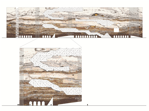 公共道路處的立面由多面玻璃組成,與不透明的石頭形成對比。透過玻璃,向城市的路人展示了內部的零售及文化活動,而內部的游客則獲得了體驗光教的有利位置。公共環路由一系列階地組成,為展覽和表演提供了空間。