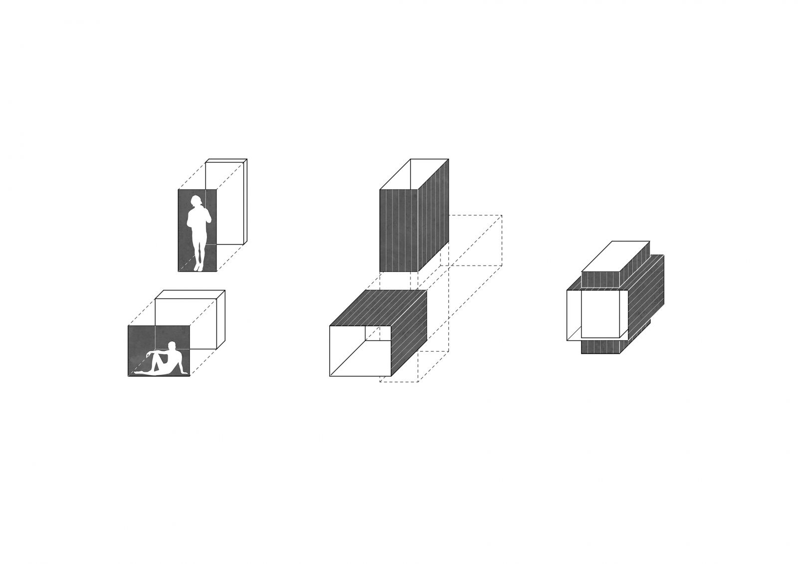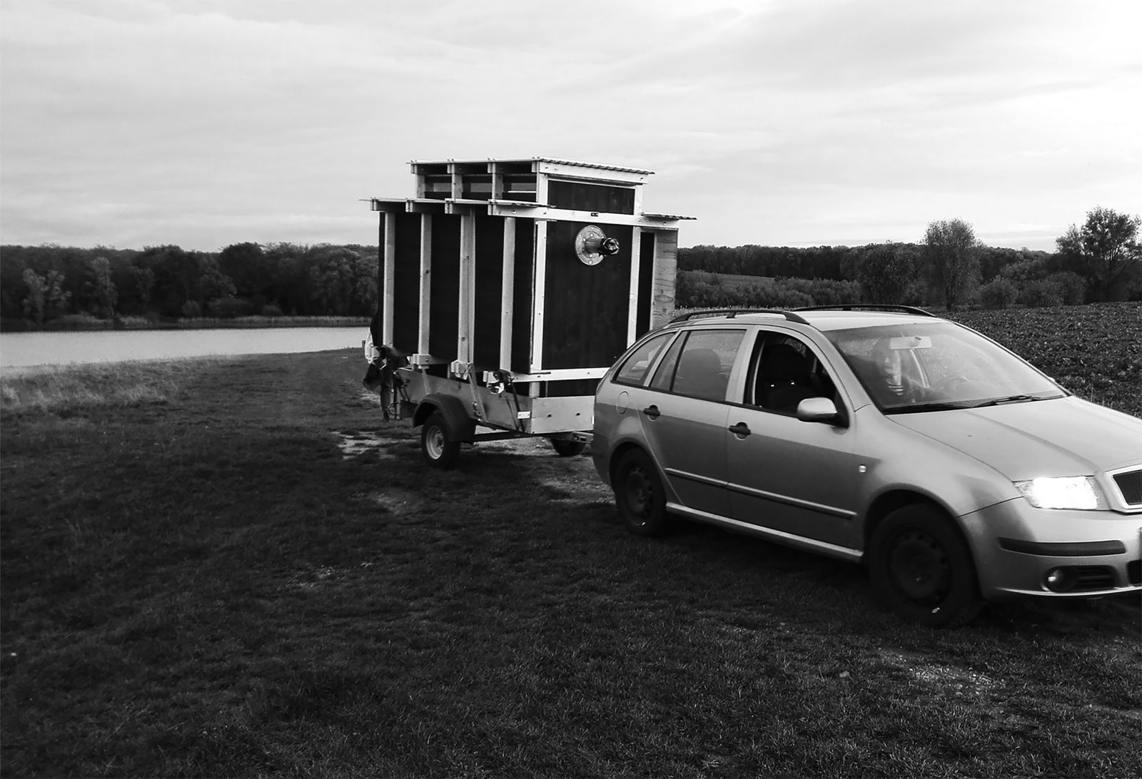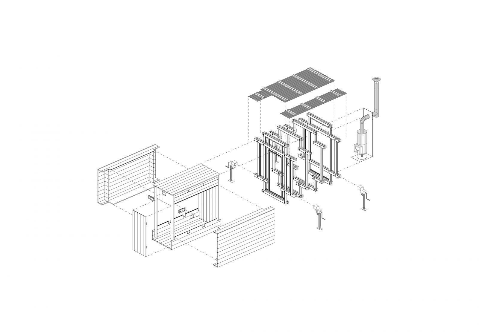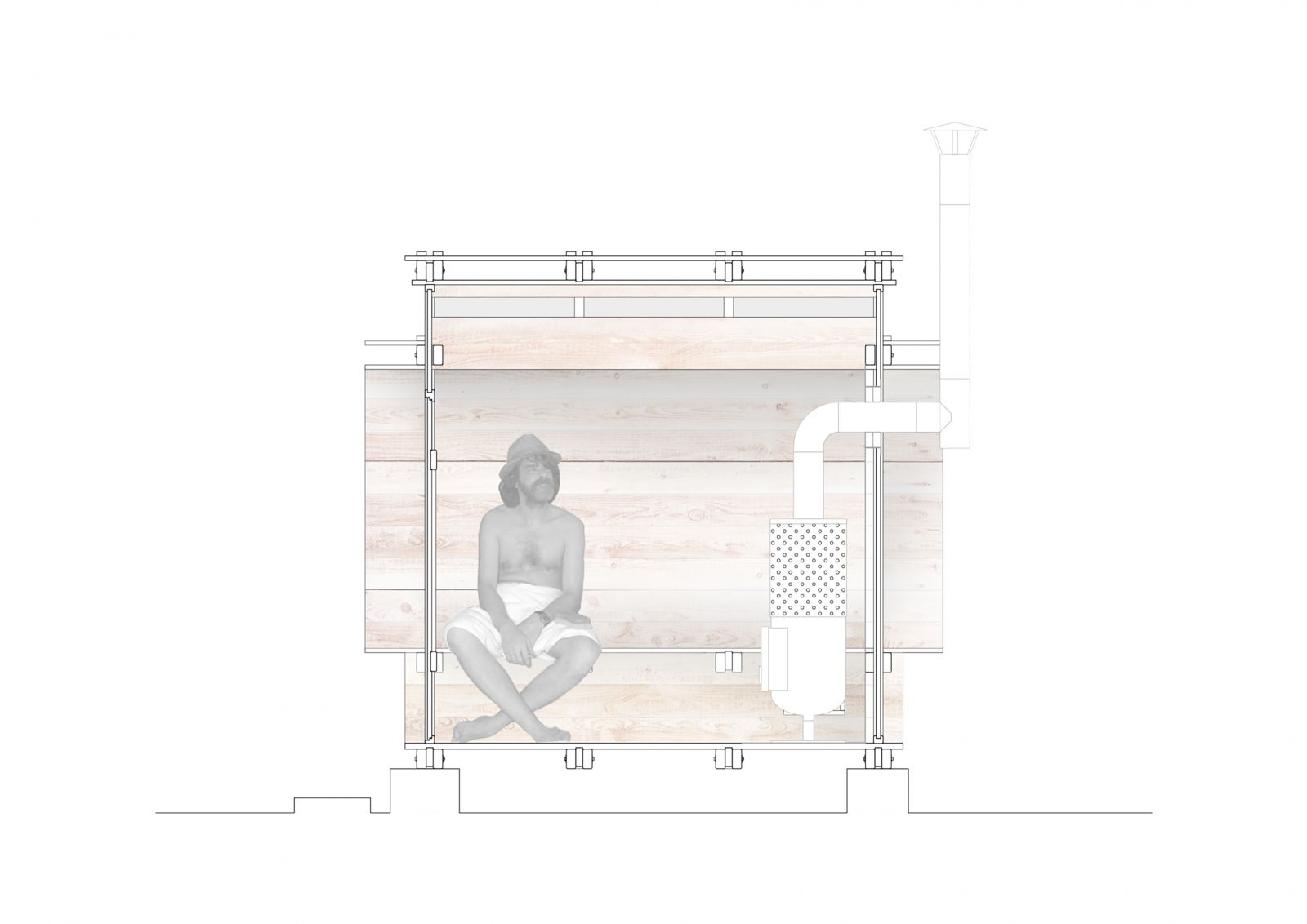 The sauna room, offering space for up to four people, is formed by two spatial bodies pushed into each other along the axes of movement. The upright body with skylights helps to straighten and orientate oneself when entering and leaving the building. The wider body increases the floor space limited by the trailer and forms the side benches. Dealing with wood is about taking into account the material’s typical properties. By avoiding synthetic materials, a solid wood construction appeared which meets the requirements of a characteristic sauna with optimal weight reduction.