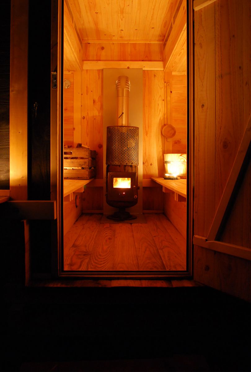 While the construction is kept undisguised and easily readable outside, the clear, tidy interior avoids any distraction. Apart from the stove, made from a recycled gas bottle, there are no metal parts inside. This would heat up considerably at the high room temperatures and lead to unpleasant burns on physical contact. The inside of the boards are untreated, while the old Japanese wood preservation method „Shou Sugi Ban“, is used on the outside. The flame treatment of the surface ensures a durable and natural impregnation. The resulting black coloring additionally accentuates the contrast between interior and exterior.