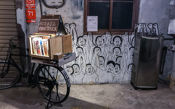 從村口即可領(lǐng)取寶藏巖的導(dǎo)覽手冊(cè),沿路的導(dǎo)覽標(biāo)識(shí)完善,“家庭電影院”、“腳踏車書店”、“寶村柑仔店”……更觸手可及與可用的創(chuàng)作浸染在街角,甚至有眾多工作室敞開著大門,標(biāo)好價(jià)格的小作品旁有自助的投幣箱。這種信任感讓人將寶藏巖始終看作一個(gè)友好的社區(qū),而非售賣門票的觀光景區(qū)。