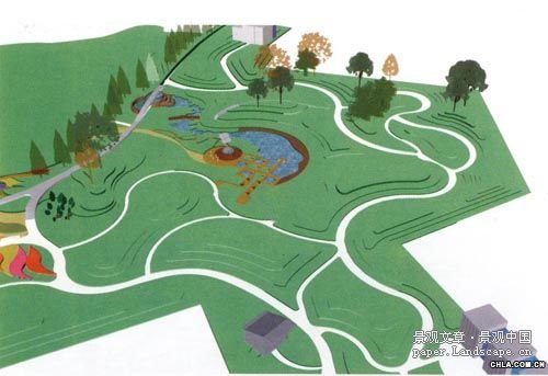 (1)黑色園(少年兒童教育基地):這里地形相對森林景觀區較低,利用現狀地形加以優化形成谷地,利用這種相對穩定和安靜的優勢作為教育孩子的場所。園內利用鋼渣模擬河水波紋和沙漠紋樣形成壯觀的大地景觀;圓形點狀座椅代表污染水中的氣泡;彎曲在氣泡周圍的黑色鋼條代表污水蔓延……使人們在娛樂和休閑的同時又受到教育。