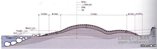 根據以上分析,鋼渣不會為造景帶來困難,相反可以有效利用鋼渣來造景。公園的道路、擋土墻、地基等設施均可利用現有鋼渣來做。而鋼渣中含有豐富的礦物質又能豐富土壤,在鋼渣上覆土達到一般樹木生長所需的厚度(約45cm)(圖13),就能使樹木存活。從另一個角度看,這也是一個很好的鋼渣實驗基地,既能有效地發掘鋼渣更多的用途,提高它的經濟效益;又可以以其材質的特殊效果創造出藝術作品,結合景觀場地設計和環境藝術設計,豐富人們的生活和視覺感受。