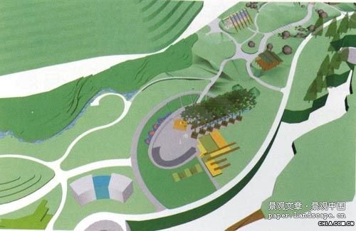 中心融合景觀區位于全園中心,是森林等自然景觀和人文景觀的結合點,不僅是理念上的融合也是景觀形態上的融合,更是人的游憩行為的融合。這里安排了大型的廣場約容納超過200口0人,為舉行大型集會活動提供了場所(圖15)。隱喻著人與自然的和諧統一,人與歷史、與文化、與藝術的和諧統一。作為整園的中心景觀,規劃創造多樣的游憩活動景觀,形成人與自然的互動,注重生態營造,營造場地文脈的延續和再生,滿足以人為本的現代景觀。