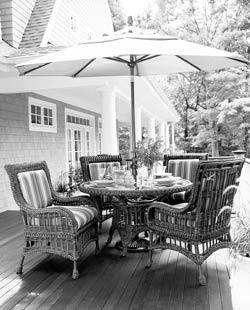 作為露臺的另一個必要元素,遮陽傘的白色純凈清新,為了突出整體風(fēng)格,傘柄上有華麗的雕刻。藤質(zhì)桌椅的歐式古典風(fēng)格十分強烈,做工和造型古樸精細(xì)。椅子上的布藝部分運用了豐富的線條圖案,對藤質(zhì)部分較為厚重的色調(diào)進行了糾正。