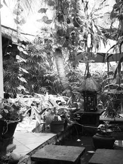 庭院里,有一方頗能體現(xiàn)東南亞情調(diào)的石砌水池,池水深綠,甚至略顯渾濁,卻有渾然天成之感。池中還立了一只東南亞石燈,其古樸的亭子造型與水池相映成趣。