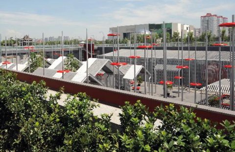 奧林匹克森林公園中心區(qū)下沉式廣場(chǎng)一角(7月6日攝)。在奧林匹克森林公園中心區(qū),有一處經(jīng)過(guò)精心打造的下沉式廣場(chǎng)。這個(gè)被稱為“地下宮殿”“中華傳統(tǒng)藝術(shù)長(zhǎng)廊”的下沉式廣場(chǎng),距地面12至17米,由南向北依次排列著7個(gè)“院落”——御路宮門,古木花亭,中國(guó)鼓墻,荊楚編鐘,青磚灰瓦的四合院,氣勢(shì)恢弘的紫禁城紅墻……這些極富中國(guó)特色的景觀,將給各國(guó)運(yùn)動(dòng)員和游客獻(xiàn)上一場(chǎng)濃縮了中華民族幾千年經(jīng)典文化的“視覺(jué)盛宴”。新華社記者王頌攝