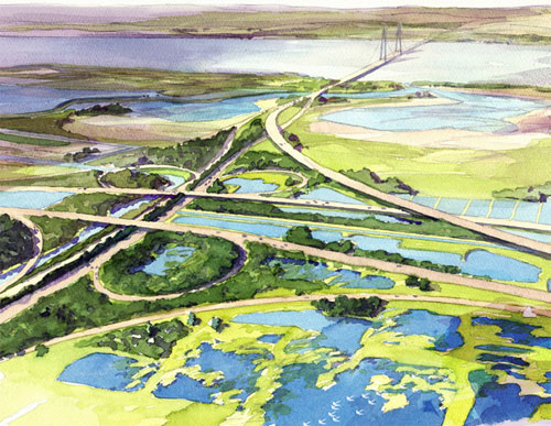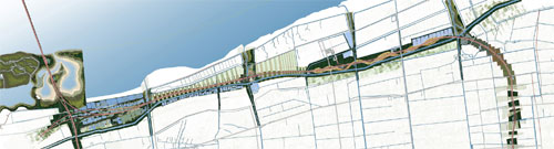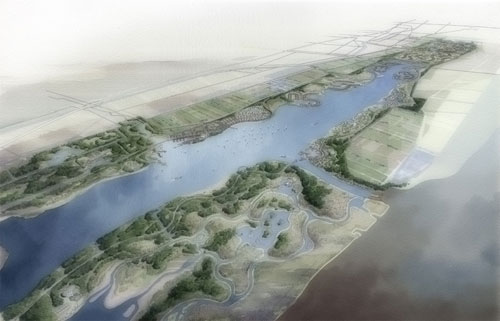 緊鄰北湖地區(qū)西端的崇啟通道包括兩座立交橋、穿越長江的隧道以及崇明島上32公里長的高速公路。它是貫穿崇明島、南北連通上海和江蘇的大型交通鏈接。32公里長的高速公路兩旁須設(shè)置200米寬的隔離帶,很可能破壞周邊生態(tài)棲息地和區(qū)域獨特的形態(tài)和結(jié)構(gòu)。易道采用獨特的規(guī)劃、景觀、生態(tài)和經(jīng)濟多學(xué)科合作的設(shè)計方法,沿高速公路設(shè)計保護性的隔離帶,傳承崇明島獨特的景觀元素,充分發(fā)掘其生態(tài)價值和旅游機遇。