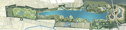 崇明北湖地區(qū)總體規(guī)劃范圍100.7平方公里,核心設(shè)計范圍34.5平方公里。基地四周環(huán)繞著農(nóng)田、蘆葦灘,以及7.7平方公里的咸水湖北湖。總體規(guī)劃目標(biāo)是保證崇明珍貴的生態(tài)系統(tǒng)的可持續(xù)發(fā)展,維持重要自然資源北湖的水域面積和水質(zhì)。經(jīng)過對生態(tài)系統(tǒng)現(xiàn)狀的綜合分析,制定嚴(yán)謹(jǐn)?shù)木坝^框架,包括14個重要分區(qū)以及每個分區(qū)獨有的維護策略,為北湖地區(qū)未來的娛樂休閑開發(fā)奠定了基礎(chǔ)。