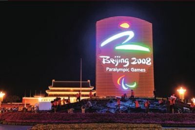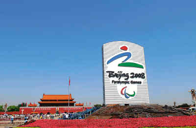 9月1日,一個巨型殘奧會會徽在北京天安門廣場與游客見面,讓人們充分感受到日益臨近的2008年北京殘奧會的熱烈氣氛。每晚7點30分至晚12時,“天地人”將會被點亮。