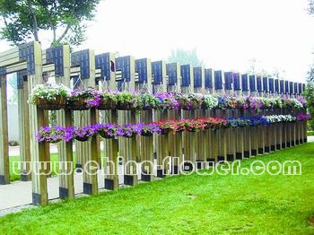 圖為朝陽(yáng)區(qū)秀木廣場(chǎng)用防腐木搭建的花架,其上垂吊著各色牽牛,感覺很大氣。