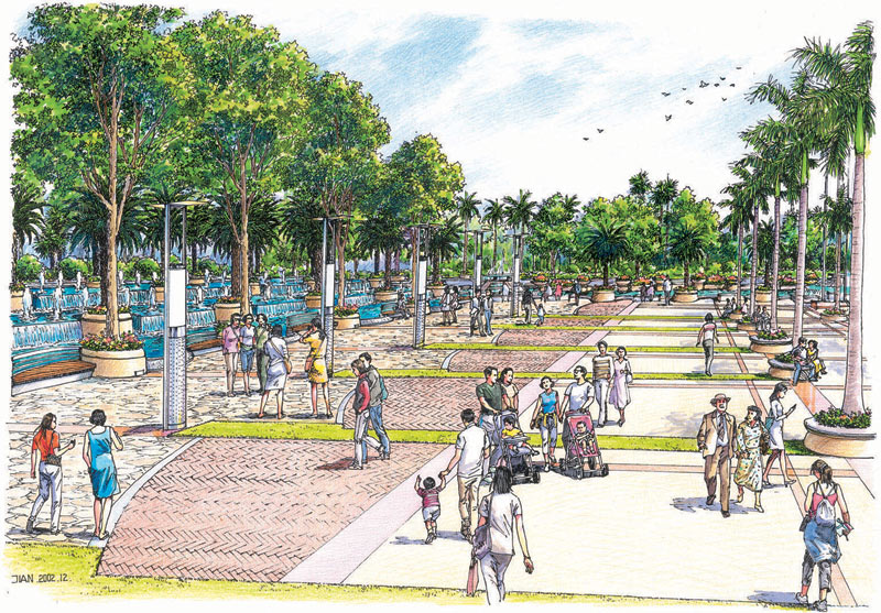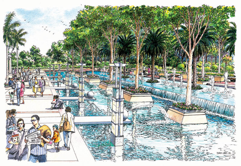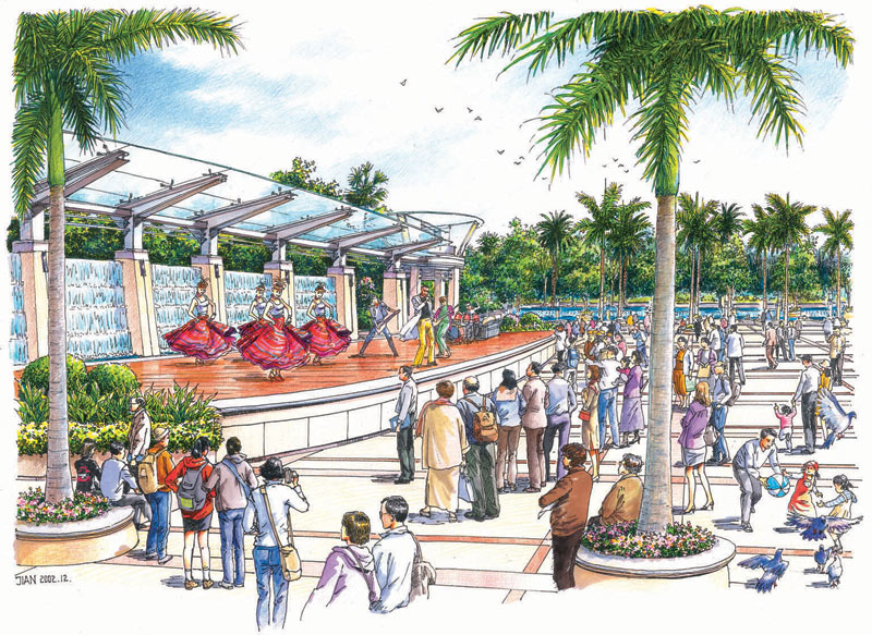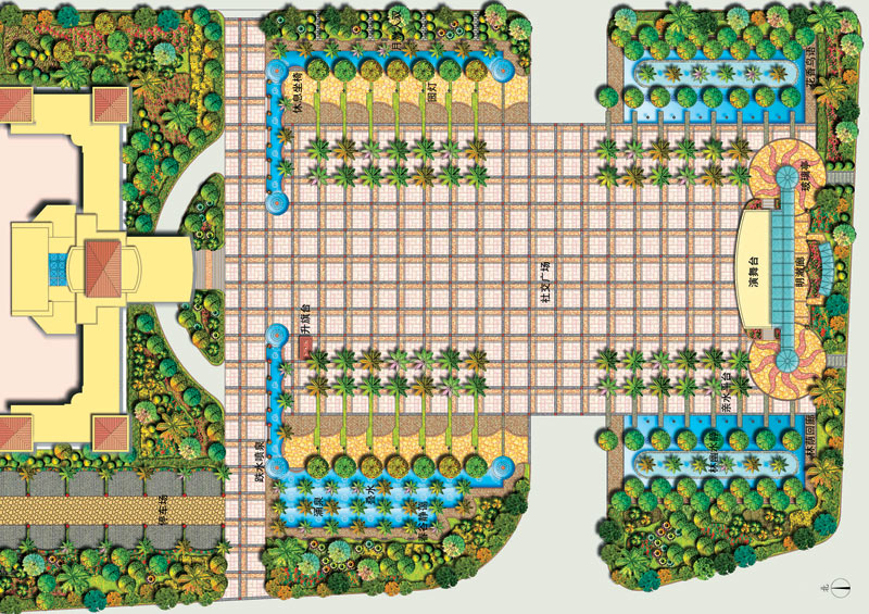 總體設計說明:東莞樟木頭文化廣場位于鎮政府前,地理位置優越。本著“文化之都,以人為本,人文氣息”的設計意旨,讓人們游于其中,體現“人在綠中行,花在叢中笑”的意境。 在設計中,以植物分隔出一個圍合的廣場空間,合理地組織車流、人流,將車流組織在大圍合的外圍;廣場以自由式的小徑為主,隨意蜿蜒青山綠水中,閑時拾步,身心俱靜;大大小小的綠洲緊密相連,使得人們可以安全、隨意地享受自然。廣場親水性強,池水較淺,人們在欣賞水景的同時,還可親身接觸;廣場綠化充分運用美景原則,采用適合廣東地區的樹種,做到點、線、面相結合,大、中、小相結合,集中與分散相結合,重點與一般相結合,以形成一個完整的系統。廣場照明設施的功能不限于夜間照明,還注重燈具白天的景觀效果,做到統一、連續、整齊,讓整個廣場洋溢在明麗、歡快、祥和的氣氛中。 總平面圖 春谷靜藹景觀 林幽水靜景觀 表演舞臺景觀 中國風景園林網獨家稿件聲明:該作品(文字、圖片、圖表、音頻、視頻)特供中國風景園林網使用,未經授權,任何媒體和個人不得全部或部分轉載。 熱點推薦