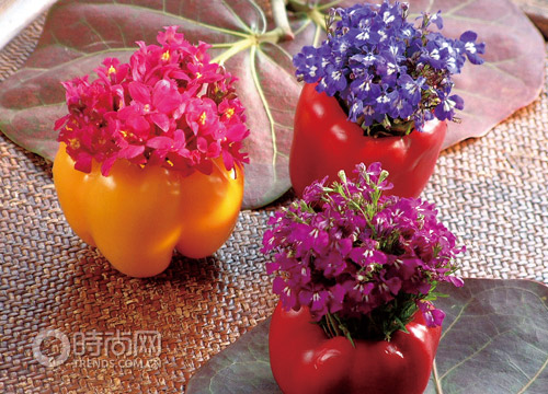 花材:六倍利;花器:彩椒(以蔬果為容器)。以彩椒為容器表現熱烈喜慶的氣氛。