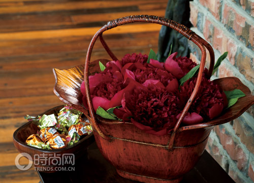 ![]() 花材:芍藥;花器:元寶形提籃。以提籃蓋當糖果盤,加上大紅色的芍藥,烘托出年節氣氛。