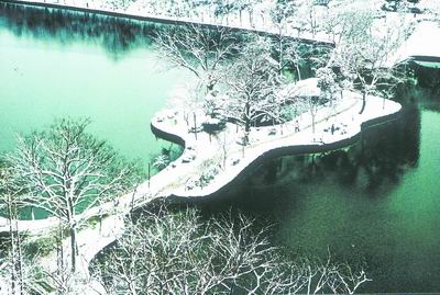 從包河景區向西便是銀河景區。站在橫跨銀河景區的桐城路大橋上,可一覽“銀河”秀色全貌。桐城路橋的前身便是合肥著名的赤闌橋。南宋著名詞人姜夔年青時曾幾次客居合肥城南赤闌橋西,并著有20多首與合肥有關的詞作。而今,橋西南角一處有姜夔塑像的“白石知音”景點即將建成,表明了合肥人對姜夔永遠的懷念。銀河景區以水為中心,四周散落著花草假山,茂林修竹,輔以江南風格的園林建筑。整個景區景色秀麗,視野開闊,人工造景與自然景色巧妙搭配,“雖系人作,宛若天開”。而西首河坡上的“迎曦亭”則是這一景區的精髓。它是個三層跌落式徽派建筑,隨地形的起落而建。清晨登亭,當晨曦初露的時候,看太陽慢慢探出頭來,天上人間,銀光燦燦,水天一色,確有“銀河萬盞星光,迎曦人立寶光中”的超凡脫俗、出神入化的境界。