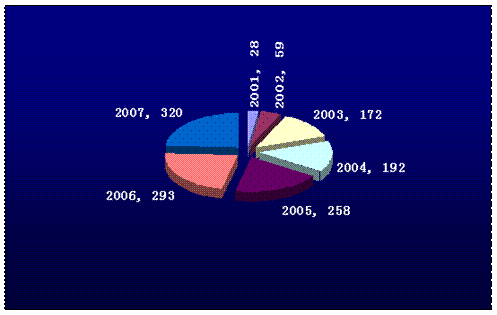 兩年來,圍繞“藍天工程”,市環保局在各有關部門的配合下,治污先治源頭,對春光電廠、市水泥廠、豐泰電石廠、天脊集團晉城化工公司等污染大戶通過技術改造進行限期治理,取締關停了市區周邊地區110余個土小企業,全面啟動了市區禁用散煤工作,實施了散煤準入市區制度,取締了污染嚴重的小型煤場66家,對17家大中型賓館、飯店及洗浴業的20臺營業性散煤鍋爐進行了治理改造,對市區建筑施工、拆遷、道路施工現場設立圍擋,硬化場地,建立水槽,對裸露地面噴灑抑塵劑和覆蓋綠網、灑水抑塵,一個個硬措施,使市區的空氣污染指數大幅下降,空氣質量顯著提高。優于二級的天數由2001年的59天,猛增到2007年的320天(見圖表)。空氣綜合指數由2001年的6.51下降到2007年的2.48,被省政府列為2007年全省空氣質量顯著改善重點城市。截止2008年7月,市區空氣質量已達國家二級標準。