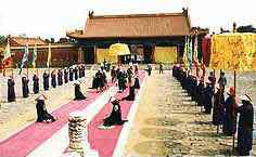 公元一六六一年,清代第一帝順治死去,葬在了東陵,當時一切創,陵寢規制十分簡陋,約在康熙中晚期,康熙皇帝組織了詳細測繪和規劃。測繪中發現東陵的山脈系承德西南的霧靈山崎嶇蜿轉二百余里,狀似一條張牙舞爪騰空面起的行龍,而陵寢兩側的山勢又恰似這條行龍的兩根觸須。于是就把這條寬三、四十里長二百四十余里的大山劃入了陵寢禁區,把陵區劃為前圈、后龍即長城以北的風水禁山。把前券后龍的全部居民驅逐外地,為打開風水線,將明代長城經由陵區的一段拆除,在陵區和禁山周圍栽置紅(內)白(中)青(外)三層界舂、舂界內圍以水圍墻,把后龍劃出三條火道,全長三百八里,各寬二十丈,每條火道每隔七里駐兵一撥,每撥七至九人,防火防汛,防止人民進入禁山,定出法律,陵區內(包括禁山)不許死人埋人、修廟、供神。私入禁山紅舂以內者,為首枷號兩月期滿積邊煙瘴地方充軍,為從者,枷號一月,杖一百,徒三年。從此,周圍六百余里的東陵區內,成了清帝神圣不可侵犯的禁地,這里的居民背井離鄉,像牛羊一樣被趕到了外地,除了東陵的官員和他們的家屬以外,任何人休想再次踏入禁區。