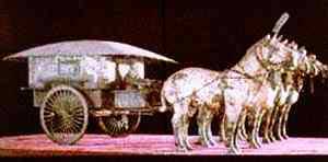 陵墓地宮中心是安放秦始皇棺槨的地方,陵墓四周有陪葬坑和墓葬400多個,范圍廣及56.25平方公里。主要賠葬坑有銅車、馬坑、珍禽異獸坑、馬廄坑以及兵馬俑坑等,歷年來已有5萬多件重要歷史文物出土。1980年發掘出土的一組兩乘大型的彩繪銅車馬--高車和安車,是迄今中國發現的體形最大、裝飾最華麗,結構和系駕最逼真、最完整的古代銅車馬,被譽為“青銅之冠”。