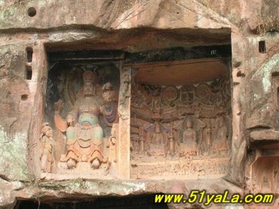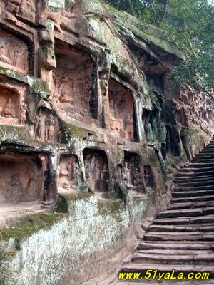 靠青衣江左岸的石壁上,排列著200多窟石刻造像共2400余尊,故稱“千佛崖”。像開鑿于隋,興盛于唐,延及明、清;造像排列錯落有致,少則獨占一窟,多則上百尊集于一窟;大可逾丈,小不及尺,造型優美,技藝精湛,姿態各異,絢麗多彩,尤以“凈土度”為佳;顯示了中國古代高超的石刻藝術水平。