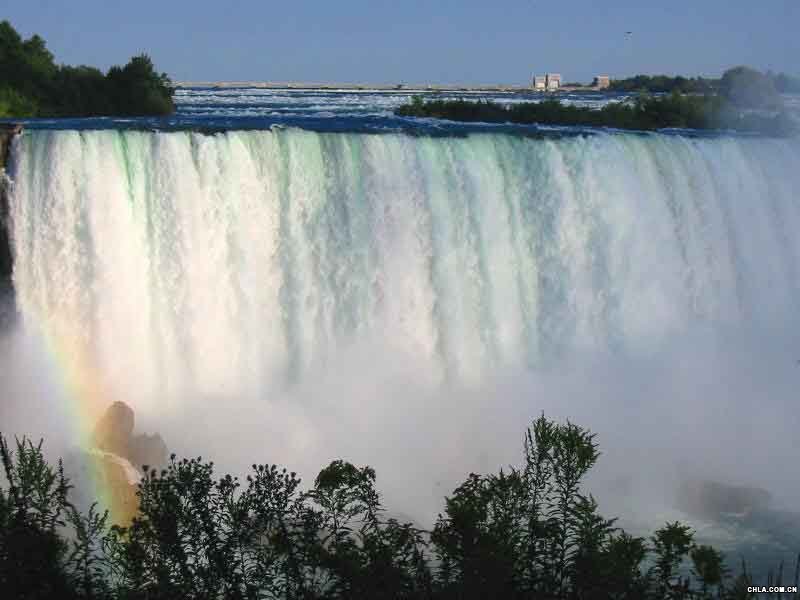 尼亞加拉瀑布(英語:Niagara Falls,法語:les Chutes du Niagara),也直譯作拉格科或尼加拉瀑布 (臺灣媒體常誤譯為"尼加拉瓜瀑布"),印第安語意為‘雷神之水’。瀑布位于北美洲五大湖區的尼亞加拉河上,平均流量5,720立方米/秒,并號稱世界七大奇景之一。尼亞加拉瀑布以美麗的景色,巨大的水利發電能力和極具挑戰性的環境保護工程而文明于世,是非常受游客歡迎的旅游景點。 連接伊利湖和安大略湖的尼亞加拉河流經寬約350米的戈特島(Goat Island)時跌入斷崖,并一分為二分別流入美國紐約州和加拿大安大略省,形成兩個瀑布。 美國瀑布(American Falls)為小瀑布,在東側美國境內,占6%的水量,河水呈藍色。瀑布寬323米,落差52米。 馬蹄瀑布(Horseshoe Falls)為大瀑布,也稱加拿大瀑布(Canadian Falls),在西側加拿大境內,占94%的水量,河水呈青色。瀑布呈半環型,寬792米,落差50米。