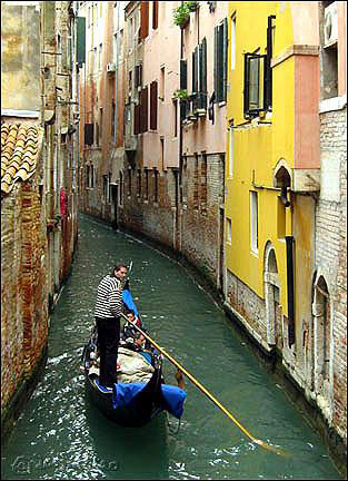 下了火車,又是透過游船的窗外,來欣賞威尼斯千古不變的華美。船走在大運河上,窗里是來自世界各地興奮的游人,窗外則是跟照片里一樣的彩色的老房子。船行悠悠,從金宅到PESARO宅,從GRASSI宮到REZZONICO博物館,從學術美術館到圣母堂,一棟棟美得無法形容的老房子在眼前掠過。每一棟都讓人覺得是一首詩,想好好解讀它。作家陳丹燕在書里說,“浮在水面上的房子,就好像是落在水面上的紙船”,又說“這房子,像就要死去的天鵝”,都是脆弱無力的詞語。我的理解是它們太美了,美得讓人不相信能天長日久地存在下去。美的東西都是容易使人傷心的。除了大房屋,運河旁還有不少普通民居,大門直接面對運河,門口泊著小船,宛如城里人門口停著私家車。無數小水道猶如樹的分叉從運河中散開來,通往不知名的地方,不禁讓人想象坐船徜徉其中會是什么樣的情形。三座橋全都能看清,最壯麗的當然是RIALTO橋,很寬,像橋上的一座細長房子;赤腳修士橋是秀美,而學術橋相對顯得嚴肅,真像一位一本正經的學者。水中的貢多拉永遠是輕搖慢擺,載著游客和戴禮帽的船夫,在大船邊不慌不忙地閑游。海鷗忽而飛起,忽而落到水面上,也是小船般不急不趕的樣子。