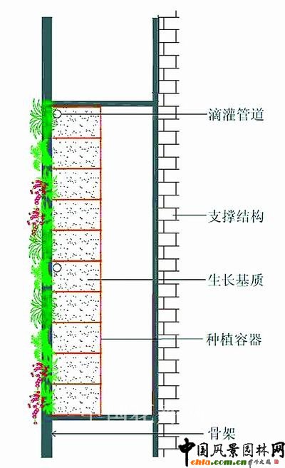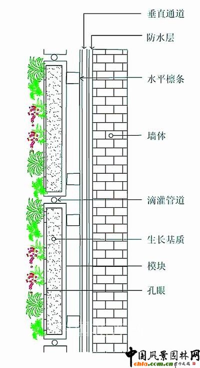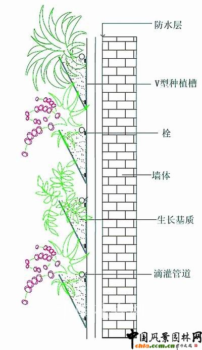 六、板槽式 即在墻面上按一定的距離安裝V型板槽,在板槽內填裝輕質的種植基質,再在基質上種植各種植物(圖6)。