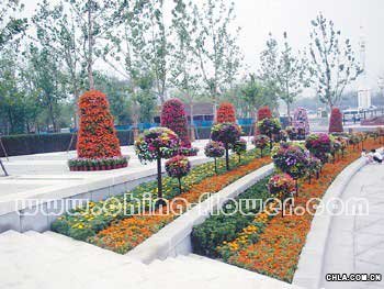 圖為臺階兩側綠化,各色鳳仙組成的花塔一字排開,塔四周用長春花圍合。臺階下部綠地以萬壽菊、百日鋪底,上部矗立用金薯、彩葉草、長春花、矮牽牛組合而成的花球。