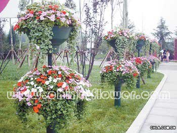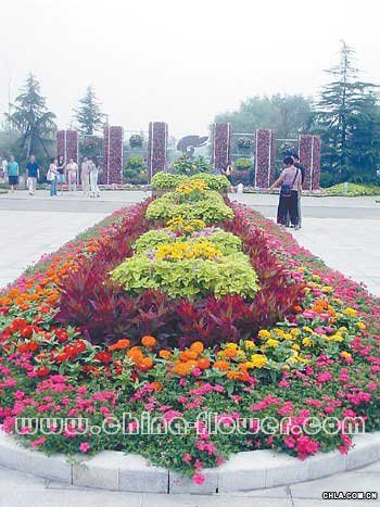 圖為廣場軸線景觀,中部是由矮牽牛、百日草、彩葉草組成的花壇;遠處是一組立式花柱,花柱間懸掛雙層花球,花柱由粉色的四季海棠組成,花球由非洲菊、鳳仙、彩葉草構成。