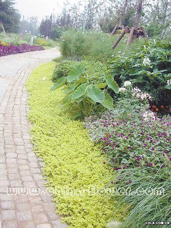圖為路緣花境,所用植物材料包括金葉過路黃、醉蝶花、千日紅、波斯菊等。