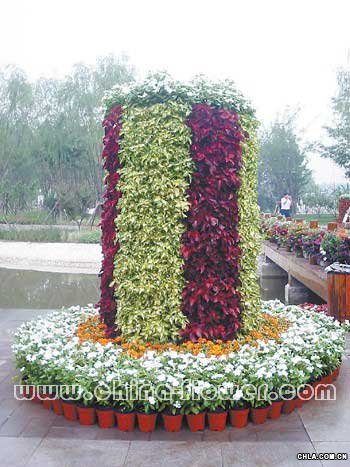 圖為道路兩側草地內布置的花柱,由各色鳳仙和常春藤組合而成。