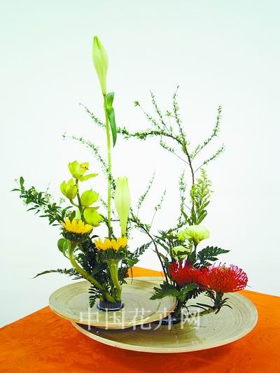 一件花藝作品,命題最考驗創作者審美情趣的高下。秦雷個性平和,加之近年又開始對佛學、易經等有興趣并開始研究,這對其作品的意境營造更是有所啟發,即使表達一些昂揚的主題,亦能含而不發。在其赴日參加世界園藝博覽會上展出的表達中國人民族氣節的作品《浩氣長存》中,亦可看出端倪。作品為“缸插”,鶴望蘭和松柏昂揚向上,“硬氣”的花材、沉穩的花器,含蓄地表達出國人骨子里的剛硬精神,令觀者動容。